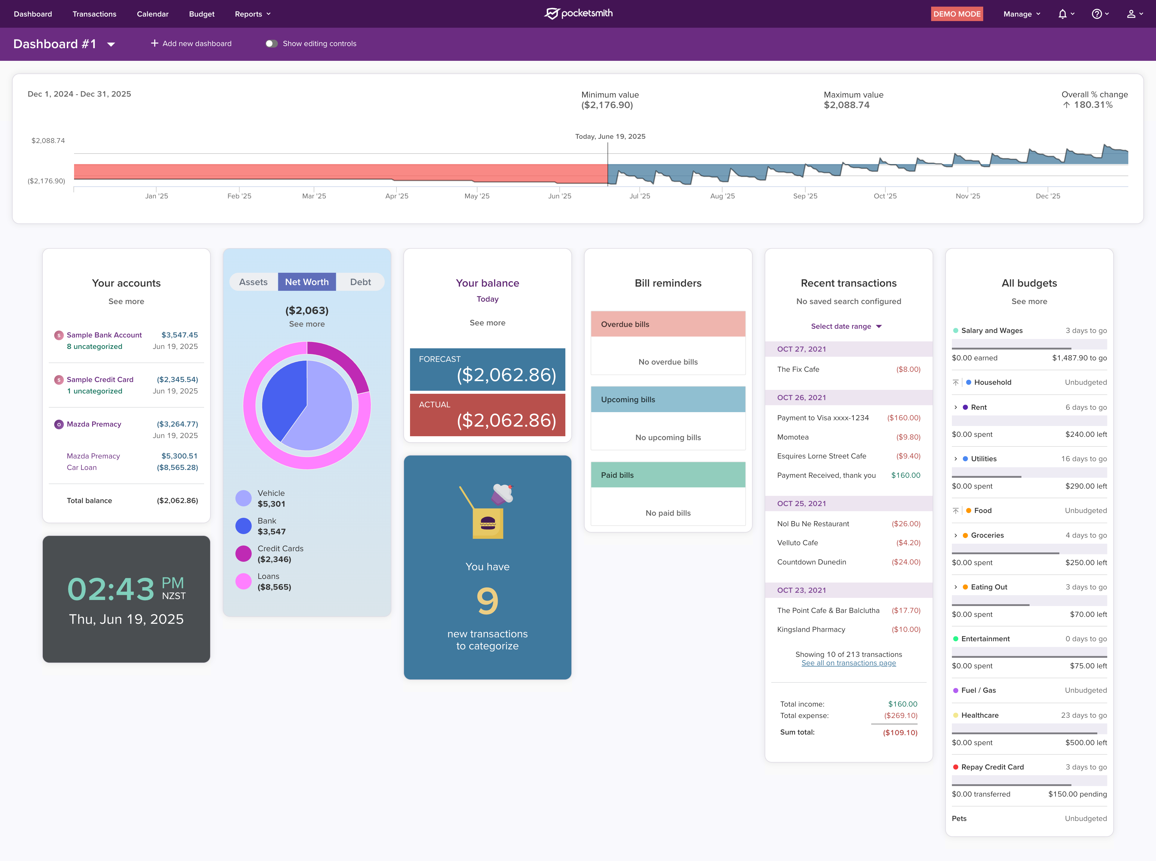 You can get as customised with your Dashboards as you like. Whether you want to view your entire financial picture all at once or a single aspect of your financial life, like your spending vs income over the past month, we’ve got you covered. We have 15 different Dashboard widgets to choose from including: